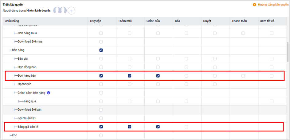 Nếu được phân quyền “truy cập”, “thêm mới”, “sửa”, “xoá”: Bạn chỉ thao tác được trên đơn hàng bán của chính bản thân mình đã tạo; thao tác được trên toàn bộ bảng giá bán lẻ được tạo trên hệ thống.
