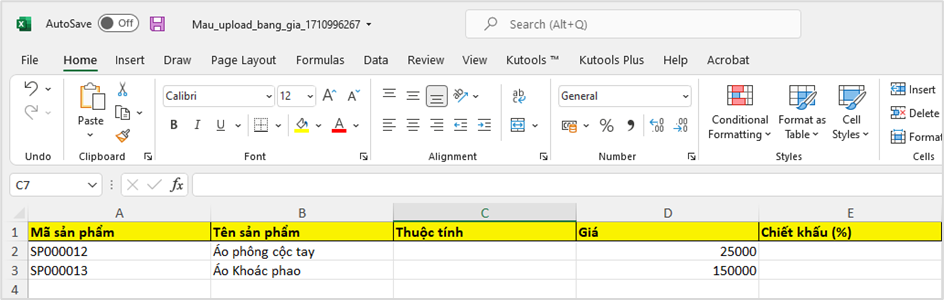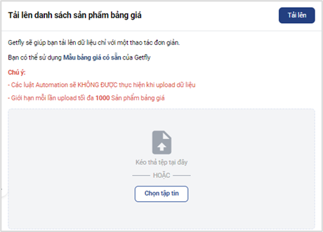 Lưu ý: Khi điền thông tin vào file excel, nội dung về cột MÃ SẢN PHẨM, TÊN SẢN PHẨM, THUỘC TÍNH phải có thông tin trên hệ thống Getfly rồi, bạn mới có thể upload được bảng giá