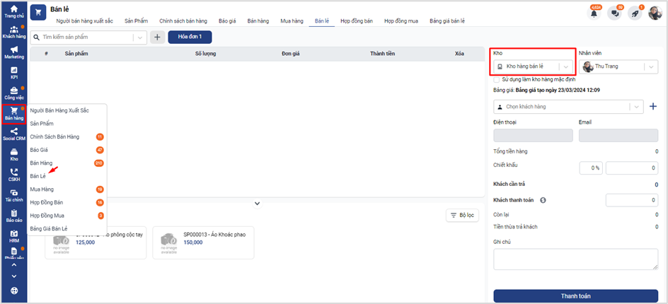 Thao tác: Click chọn BÁN HÀNG → BÁN LẺ → Chọn KHO hàng tương ứng
