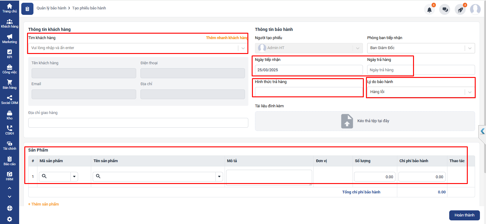 Sau khi điền đầy đủ các trường thông tin, bạn lựa chọn Hoàn thành để hoàn thành tạo phiếu bảo hành.