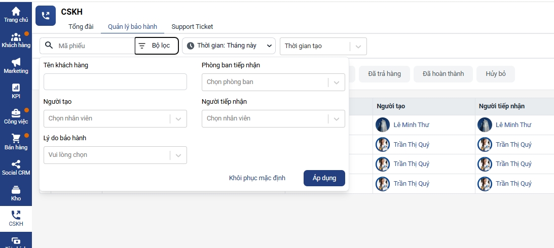 Bạn có thể lựa chọn thêm theo các điều kiện: Người tạo phiếu, Sản phẩm liên quan, ngày tiếp nhận, ngày trả hàng