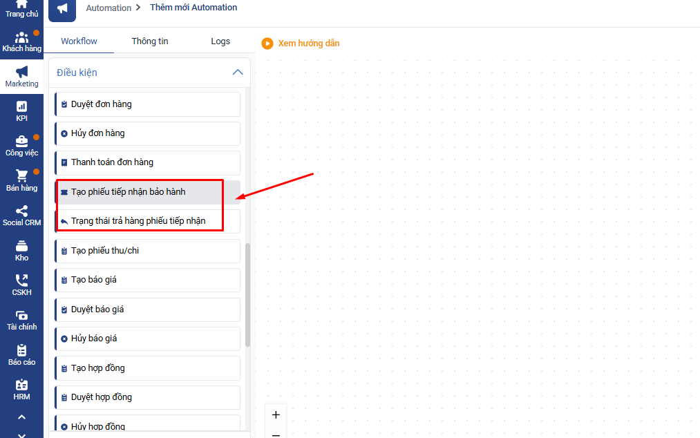 Ví dụ: Tạo Automation: Khi tạo phiếu tiếp nhận bảo bành, khách hàng liên quan được cập nhật vào nhóm khách hàng “Đã bảo hành":
