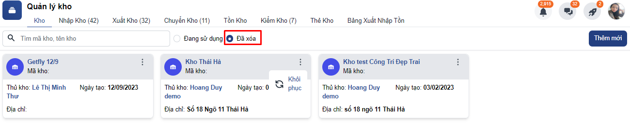 Kho sau khi xoá sẽ nằm ở mục Đã xoá, bạn có thể khôi phục kho nếu cần