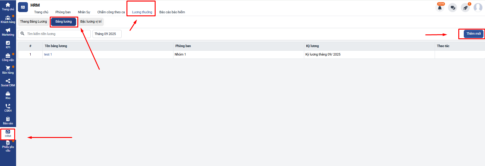 Để thêm mới bảng lương, bạn vào HRm → Lương thưởng → Bảng lương → Thêm mới