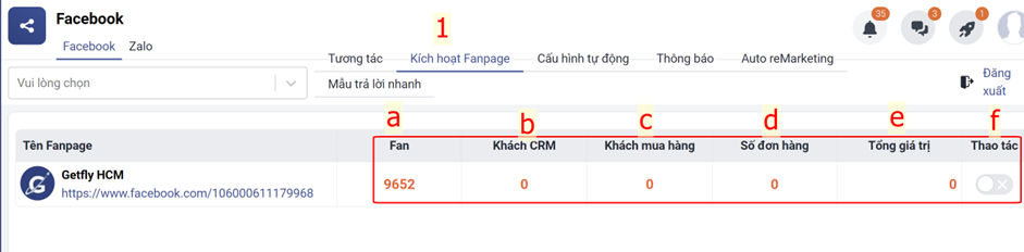 (f) Bật/ Tắt: Bật/ tắt Fanpage muốn quản lý trên Getfly