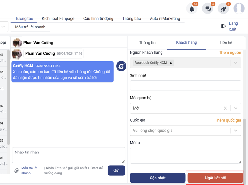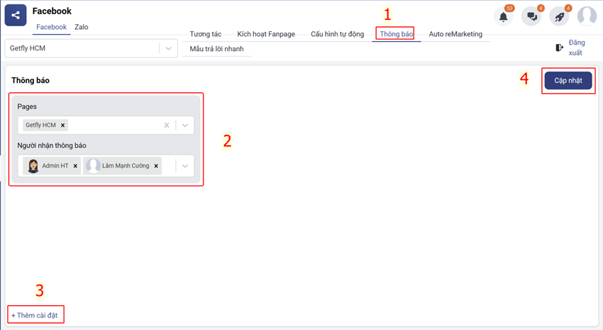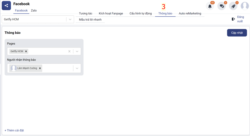 Cuối cùng để hoàn tất việc tích hợp, bạn hãy bật/tắt tính năng nhận thông báo từ Facebook trên Getfly và nhấn "Cập nhật"