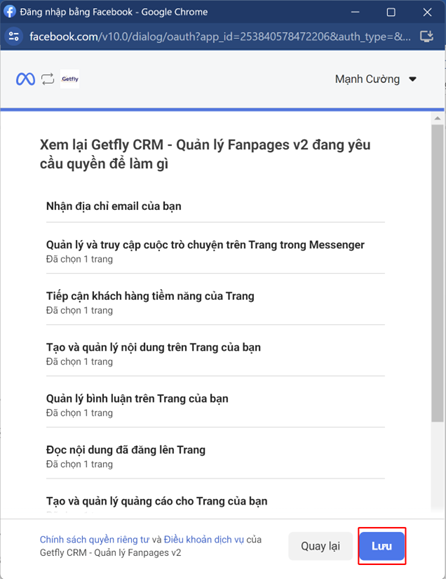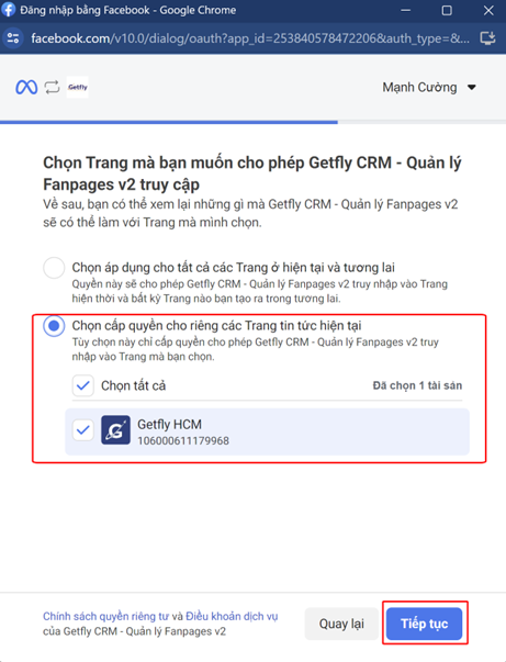 Lựa chọn Fanpage muốn liên kết với Getfly => chọn **Tiếp tục**