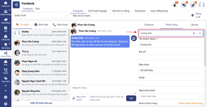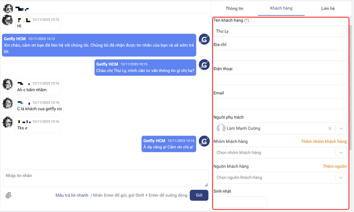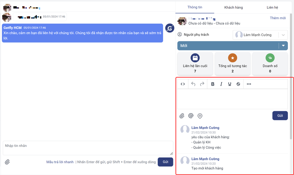 (2) Bạn có thể lưu lại lịch sử trao đổi với khách hàng tại ô “Trả lời”, phần này sẽ đồng bộ trực tiếp với phần Trao đổi trong khách hàng trên Getfly.