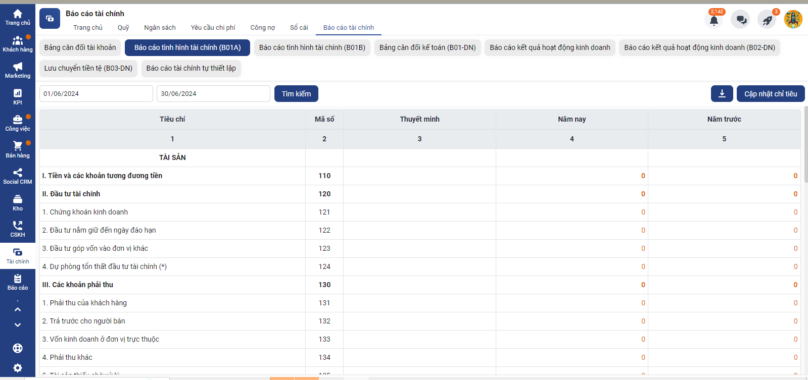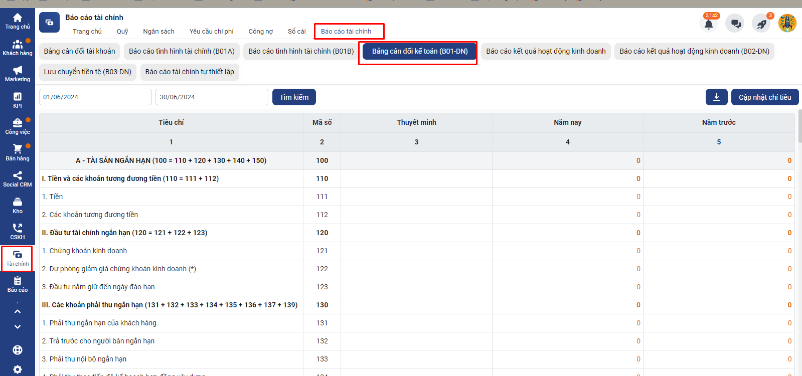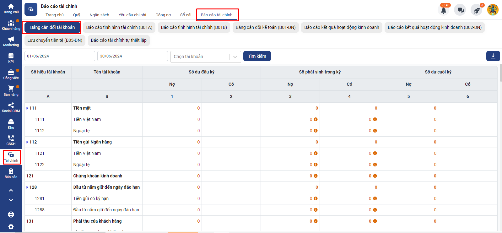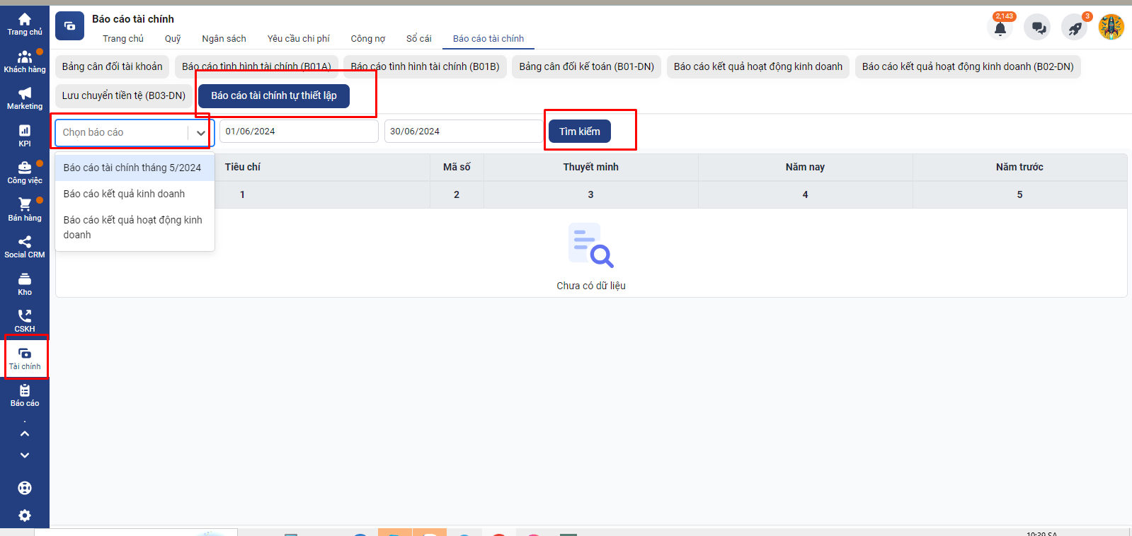 Để truy cập vào báo cáo tài chính bạn truy cập module Tài chính -> chọn Báo cáo tài chính