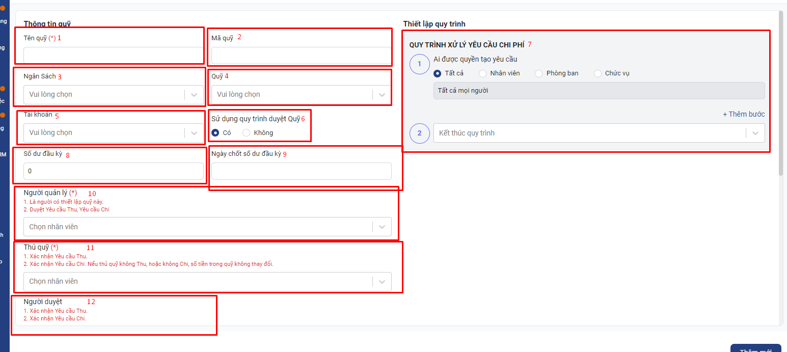 Chọn người có thể lập các yêu cầu chi phí liên quan đến Quỹ này: hệ thống đang để mặc định là tất cả, nhưng bạn có thể tùy chỉnh được theo từng quỹ. Thêm người duyệt yêu cầu chi phí: là việc bạn thiết lập thêm bước duyệt các yêu cầu chi phí. (Ví dụ: thiết lập các Trưởng phòng sẽ duyệt bước này) Kết thúc quy trình: là việc lựa chọn người cuối cùng có quyền duyệt và hoàn tất việc xét duyệt yêu cầu chi phí => Trường hợp Quỹ của bạn không áp dụng quy trình duyệt và không lựa chọn người kết thúc quy trình xử lý yêu cầu chi phí thì khi tạo yêu cầu chi phí người được chỉ định duyệt trong phiếu yêu cầu chi phí sẽ duyệt và thủ quỹ sẽ xác nhận Thu/ Chi để Thu/ Chi tiền vào quỹ.