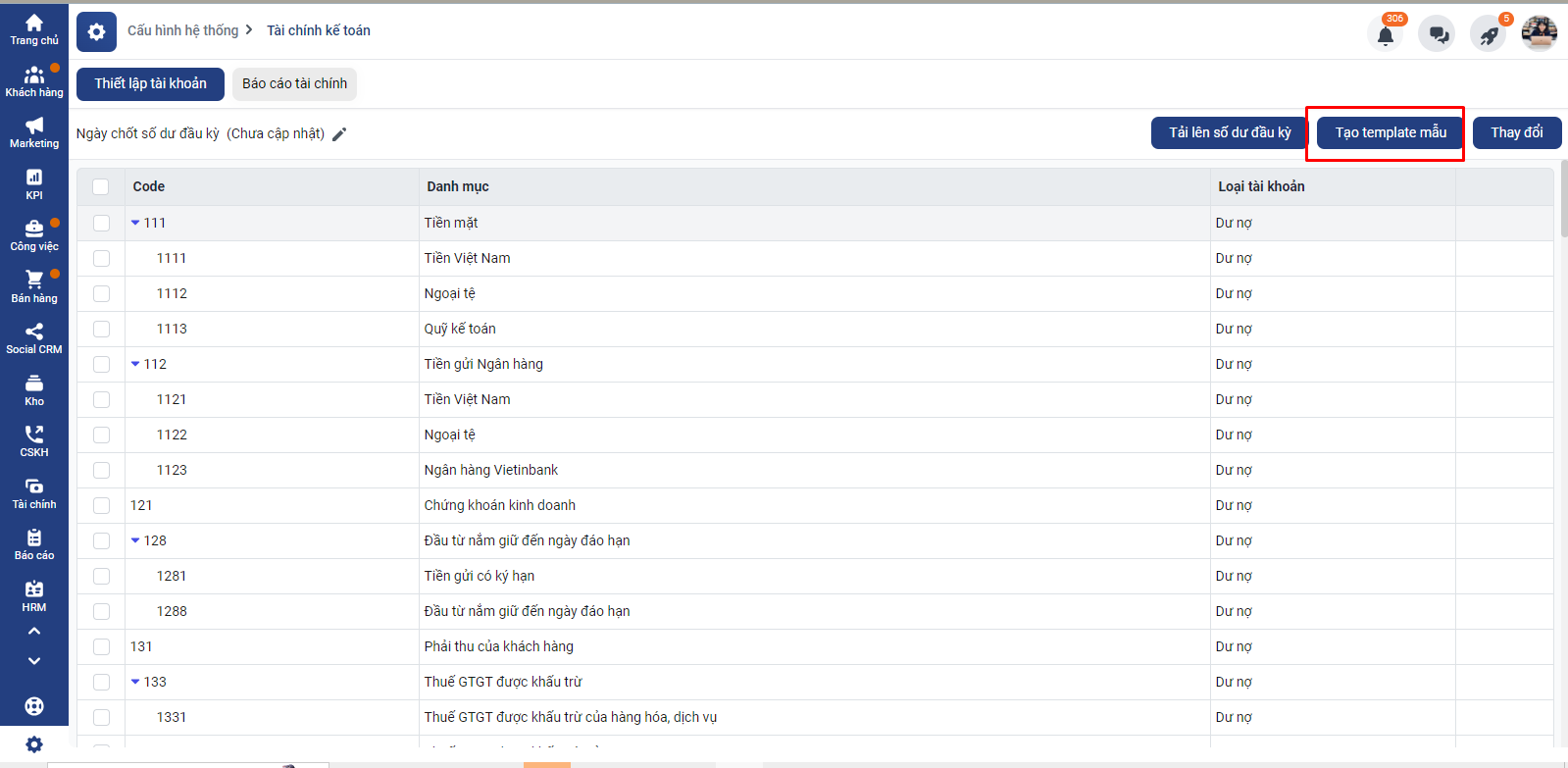 Tại đây bạn chọn Tạo Template mẫu sẽ hiển thị bảng tài khoản mẫu: