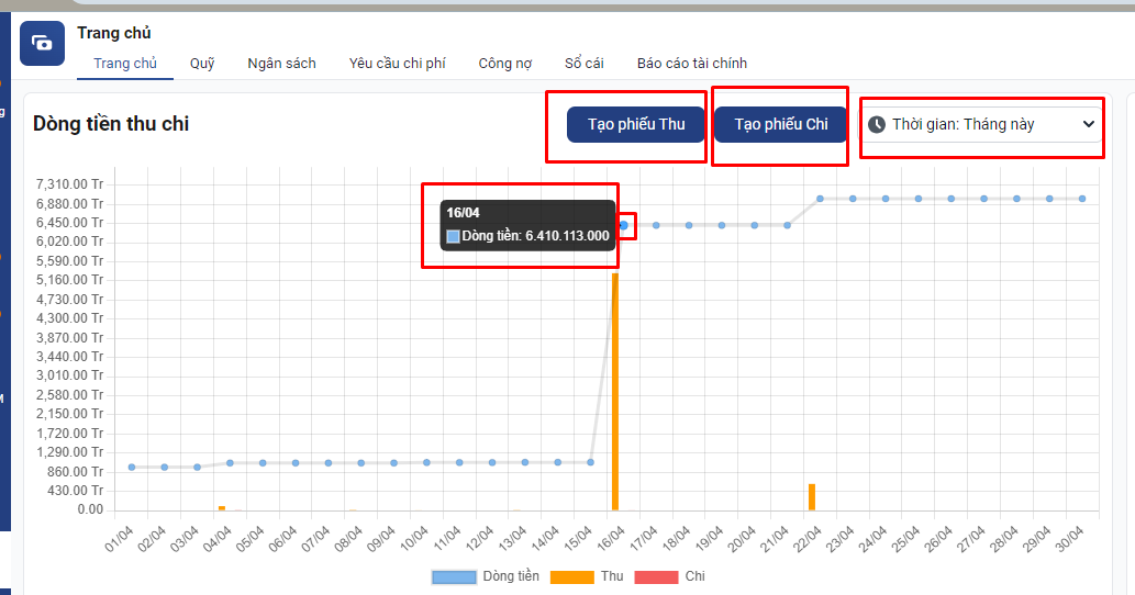 Đường thể hiện dòng tiền của Doanh nghiệp theo từng tháng khi bạn click vào sẽ hiển thị số tiền. Công thức tính dòng tiền= Số tiền tồn đầu kỳ + tổng đã Thu trong ký – tổng đã Chi trong kỳ. Tại biểu đồ dòng tiền bạn có thể tạo nhanh được các phiếu thu và phiếu chi.
