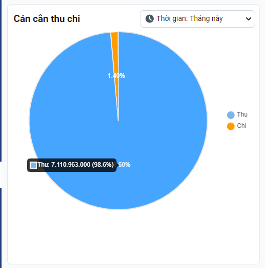 Biểu đồ sẽ hiển thị phần trăm thu chi trong kỳ bạn chọn, khi di chuột vào sẽ hiển thị số tiền thu, chi tương ứng