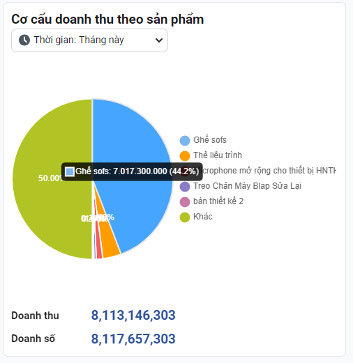 Tỷ trọng doanh thu của tốp 5 sản phẩm bán chạy nhất. Biểu đồ này cũng sẽ thống kê cho bạn theo tháng, quý, năm, thời gian khác.