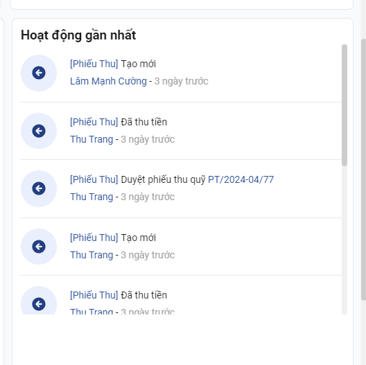 Mục này ghi nhận hoạt động tạo phiếu thu. Phiếu chi của các tài khoản sử dụng trên hệ thống.