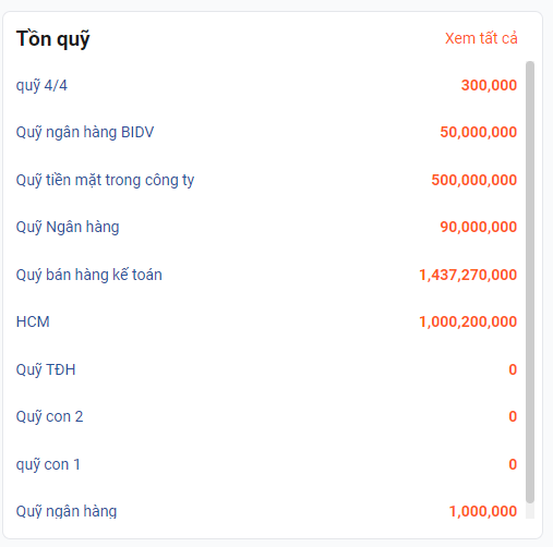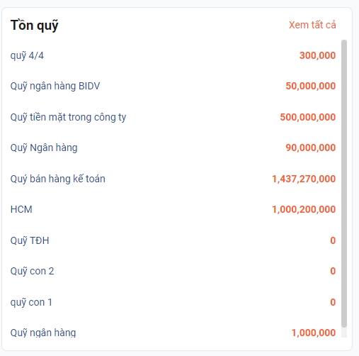 Và tại màn hình trang chủ còn giúp chủ doanh nghiệp check được nhanh tình hình tài chính của doanh nghiệp dựa theo số tiền tồn đầu quỹ.