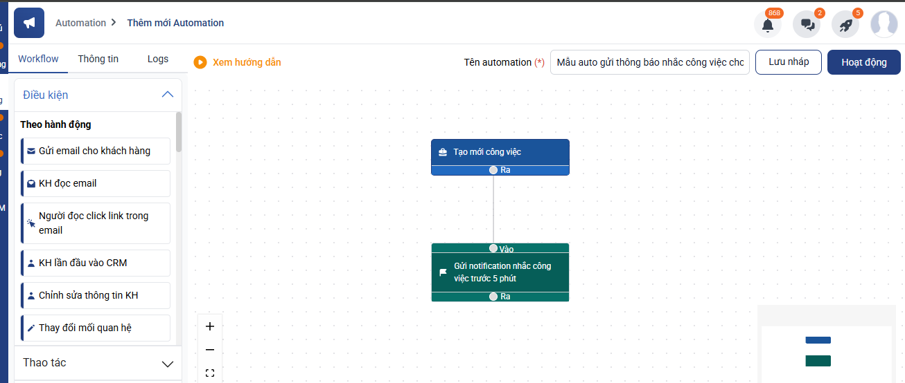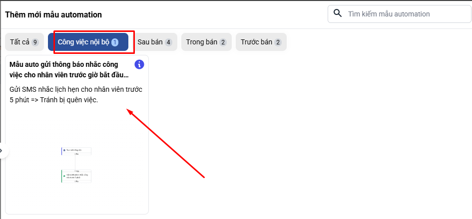 Bước 1: Marketing → Marketing Automation → Thêm mới → Chọn mẫu auto “gửi thông báo nhắc công việc cho nhân viên trước giờ bắt đầu công việc 5 phút” trong tab công việc nội bộ