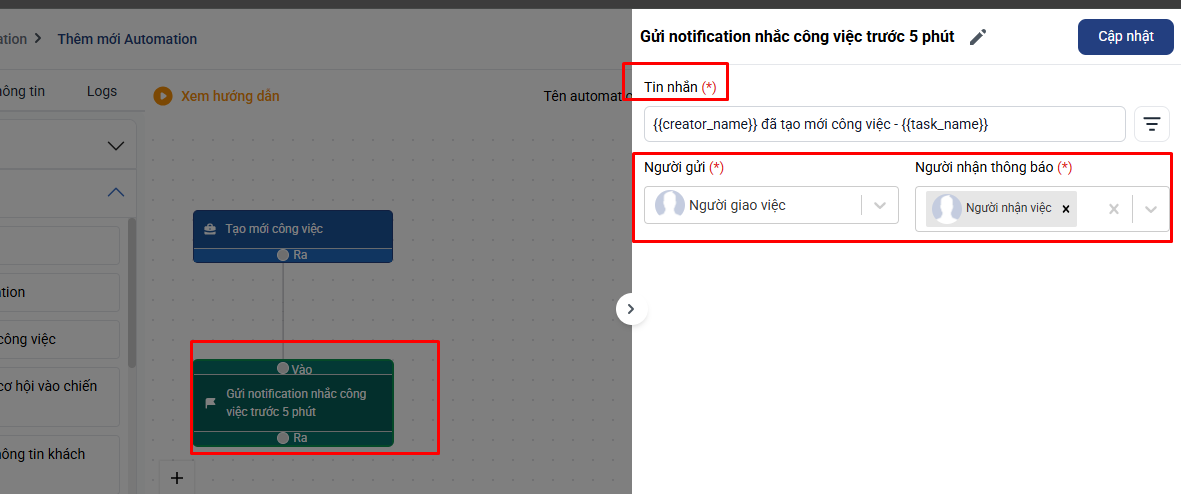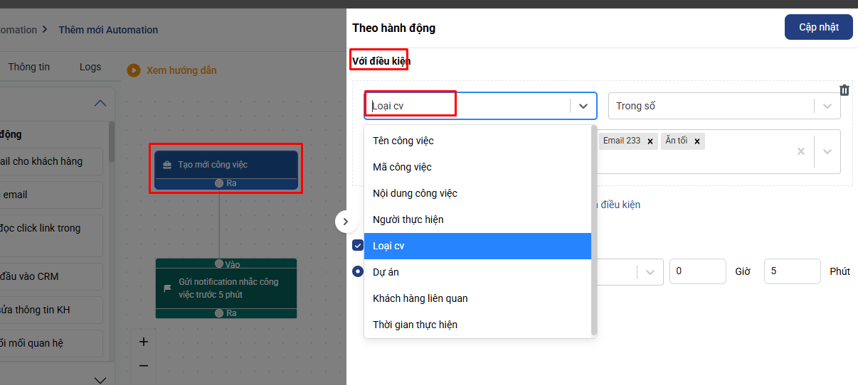 Bước 3: Bạn thiết lập lại điều kiện trong hệ quả tạo mới công việc