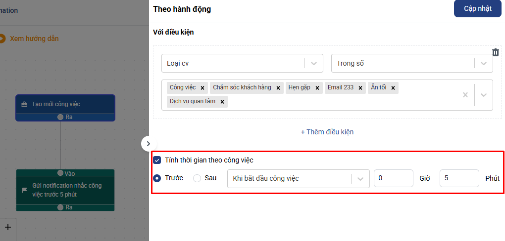 + Các bạn tích chọn Tính thời gian theo công việc, trước khi công việc bắt đầu và setup 5 phút