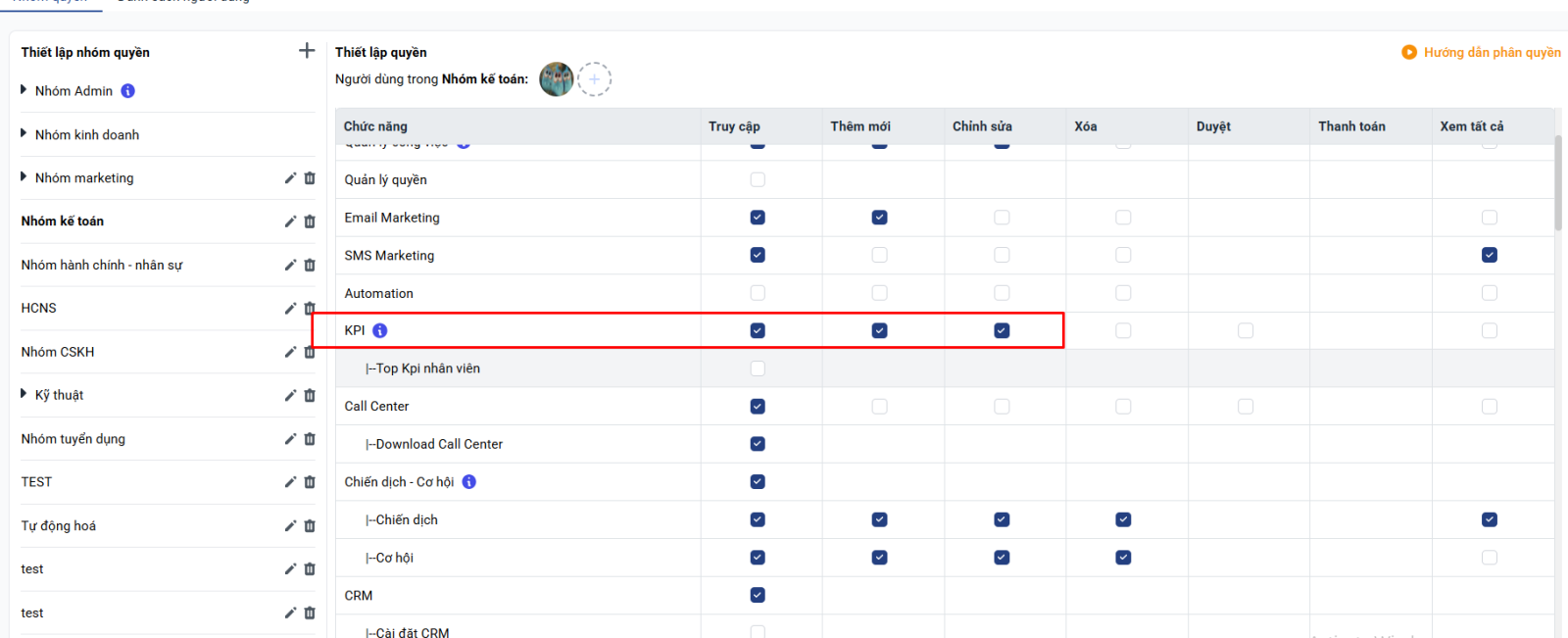 Để có thể tạo và cập nhật được KPI trên Getfly, bạn cần được phân quyền cơ bản liên quan đến KPI là: Truy cập, Thêm mới và Sửa KPI
