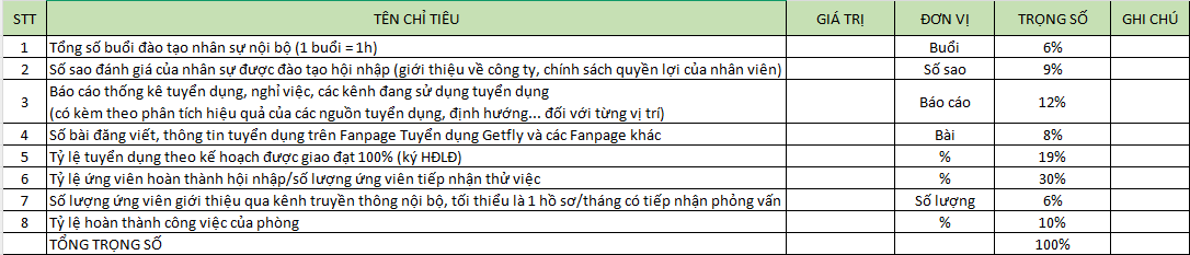 Ở mẫu chỉ tiêu KPI nhân viên HCNS Getfly có đưa ra một số chỉ tiêu phổ biến như: