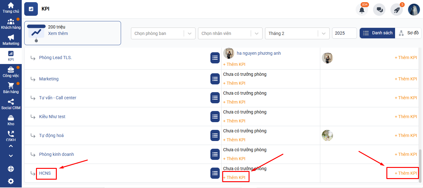 Chọn KPI → Danh sách → Chọn phòng cần giao KPI → Click thêm mới KPI