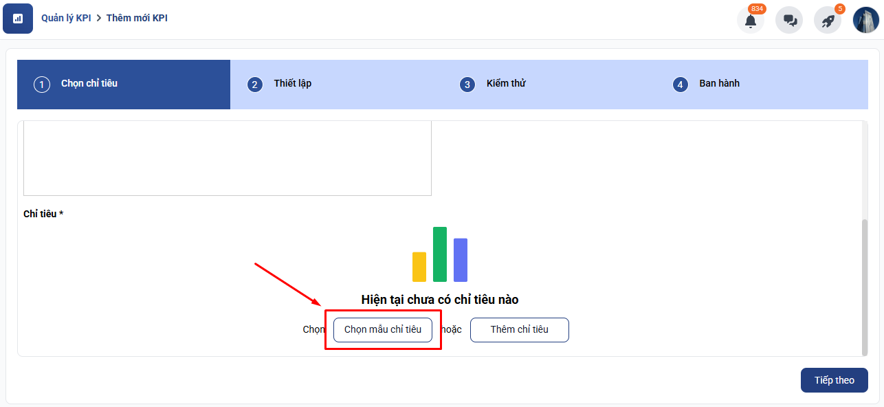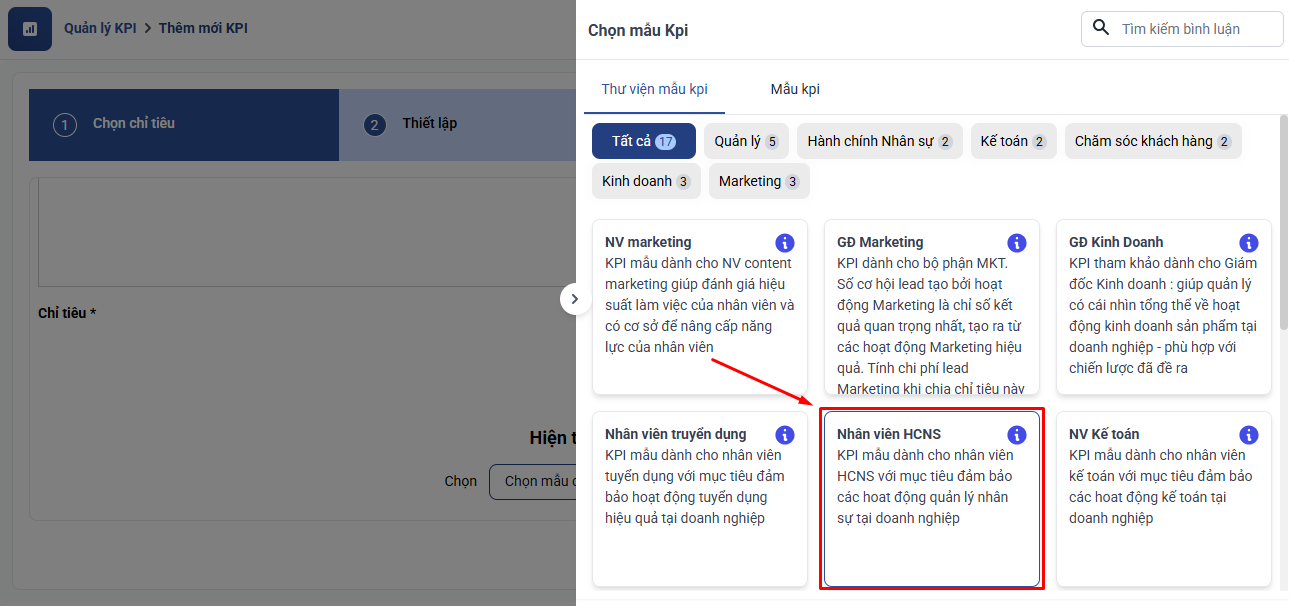 Chọn mẫu chỉ tiêu → Chọn mẫu KPI nhân viên HCNS.