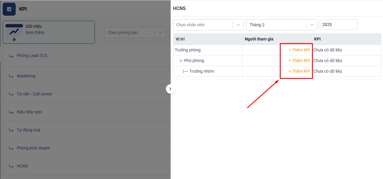 Truy cập vào KPI → Danh sách KPI → Thêm KPI → Thêm KPI ở vị trí nhân viên mà anh chị muốn thiết lập.