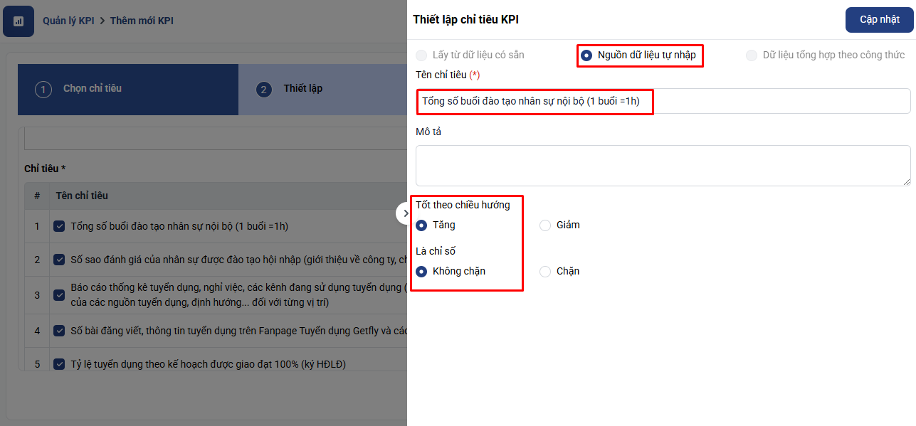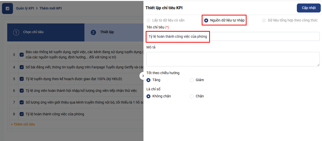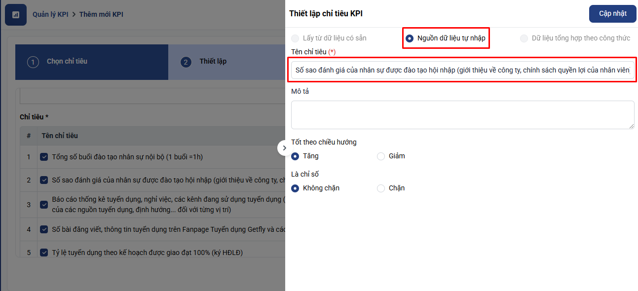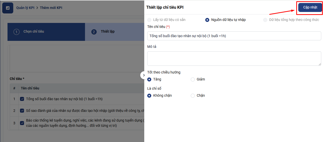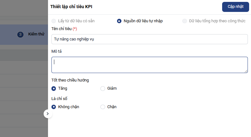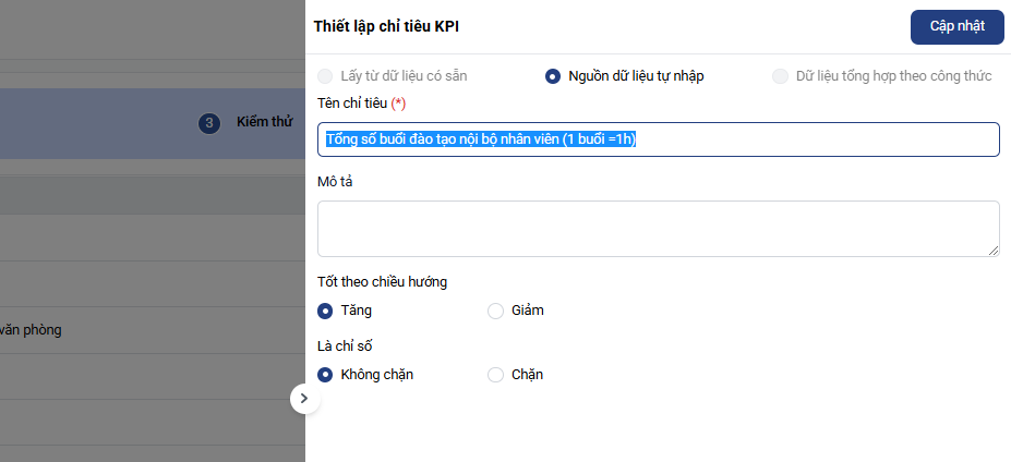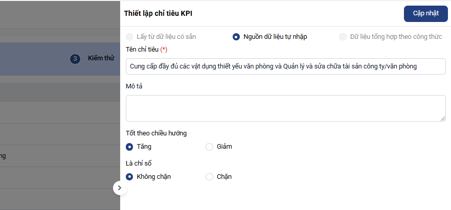 Anh/ chị có thể chỉnh sửa lại tên, mô tả các chỉ tiêu hoặc thay đổi các cài đặt trên bằng cách click nút sửa ở cuối mỗi chỉ tiêu sau đó bấm Cập nhật: