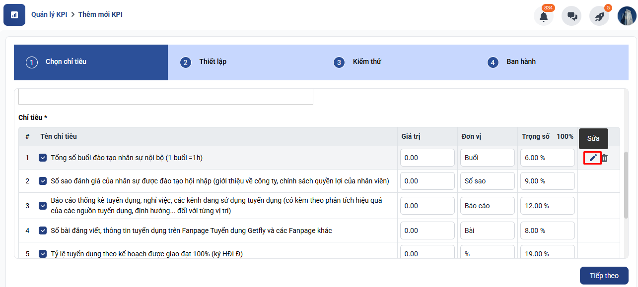 Lưu ý: Sau khi thêm hoặc bớt chỉ tiêu cần chỉnh sửa lại phần trọng số sao cho tổng trọng số bằng 100%