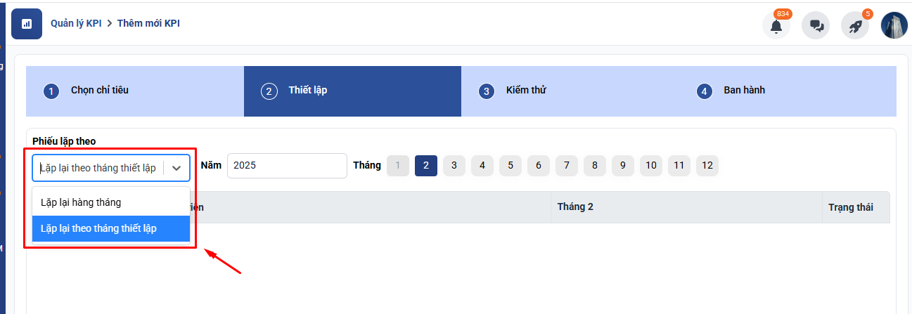 Anh/chị ấn tiếp theo và chọn phiếu KPI này theo hướng lặp lại hàng tháng hay lặp lại theo tháng thiết lập: