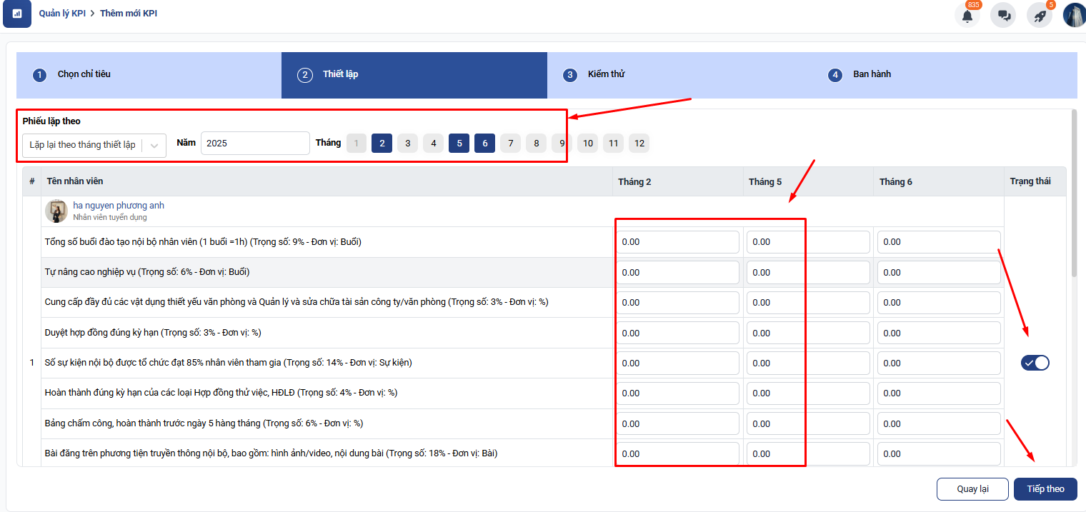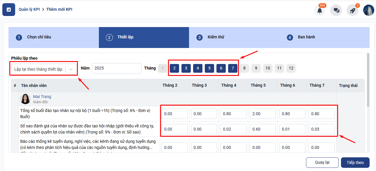 Nếu lựa chọn lặp theo tháng thiết lập anh/chị có thể click chọn từng tháng và điền mức yêu cầu với mỗi chỉ tiêu theo từng tháng khác nhau:
