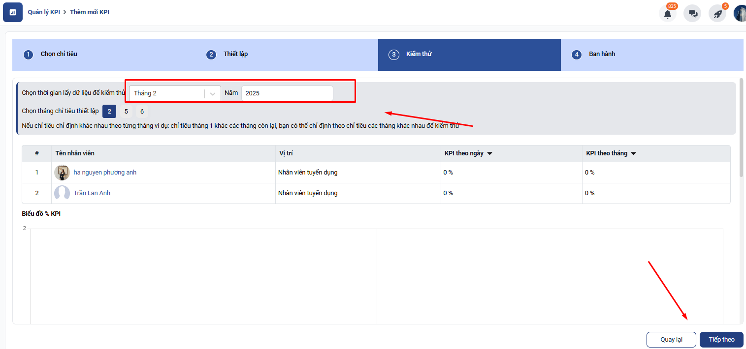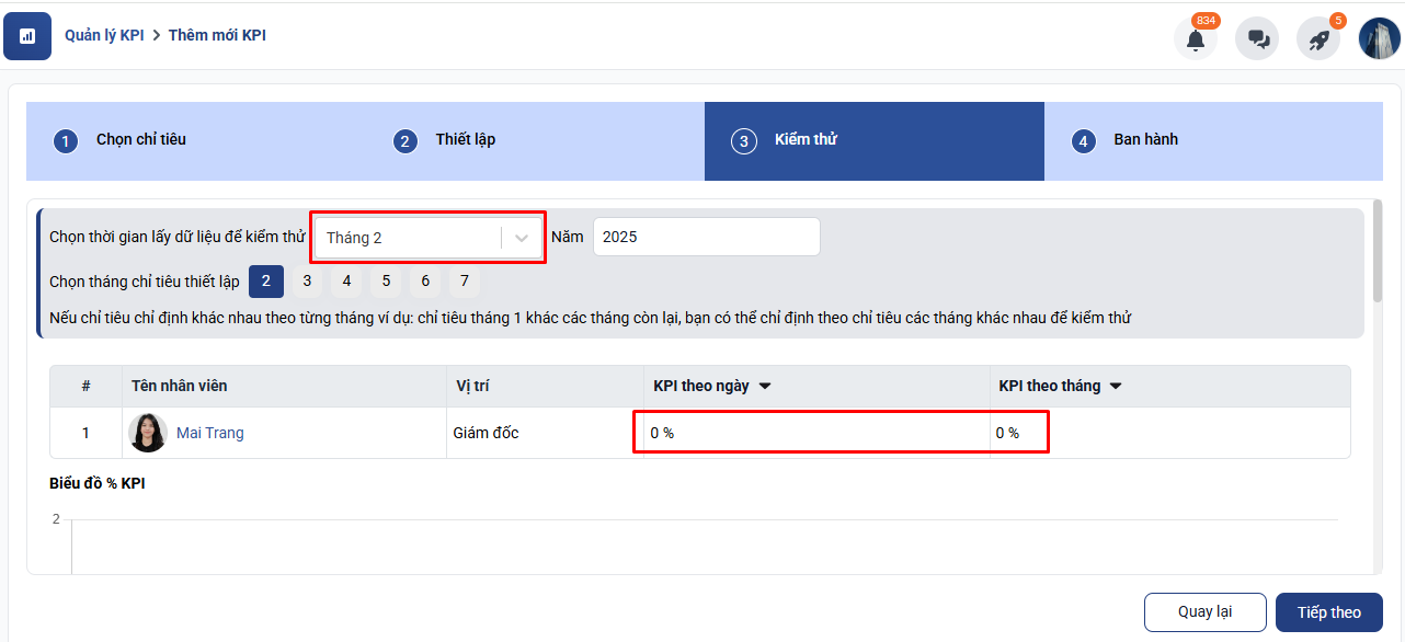 Tại bước này hệ thống sẽ tính toán số liệu dựa trên chỉ tiêu KPI thiết lập để hiển thị % KPI của bạn nhân viên đang được setup.