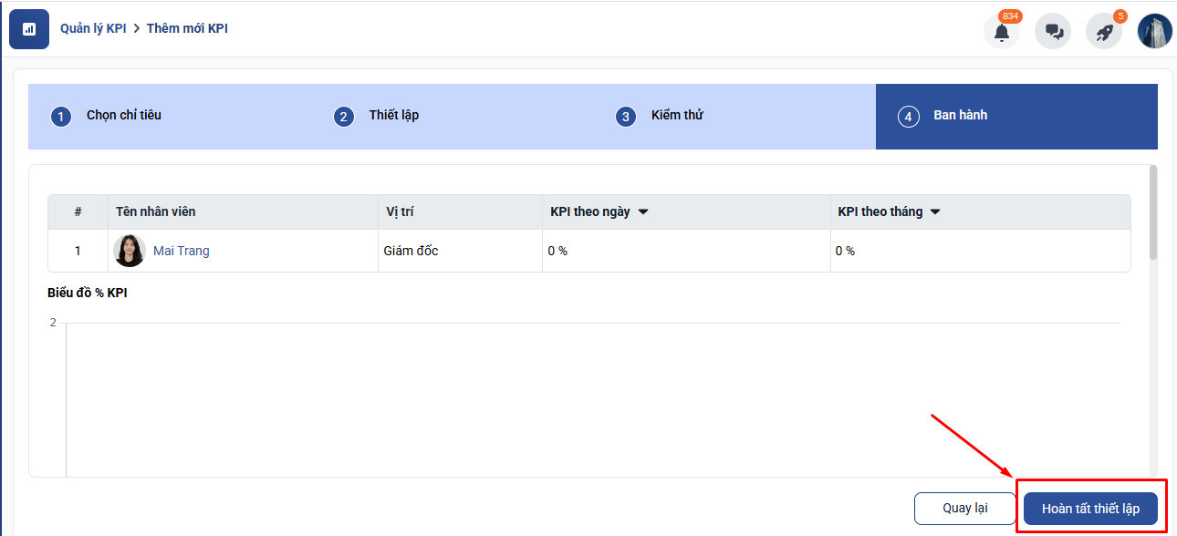 Sau khi nhập đầy đủ thông tin, nhấn Hoàn tất thiết lập để hoàn tất tạo KPI.