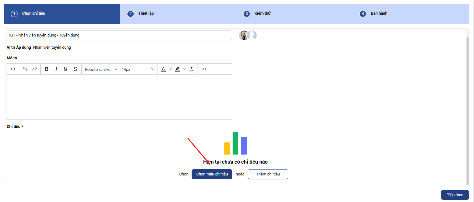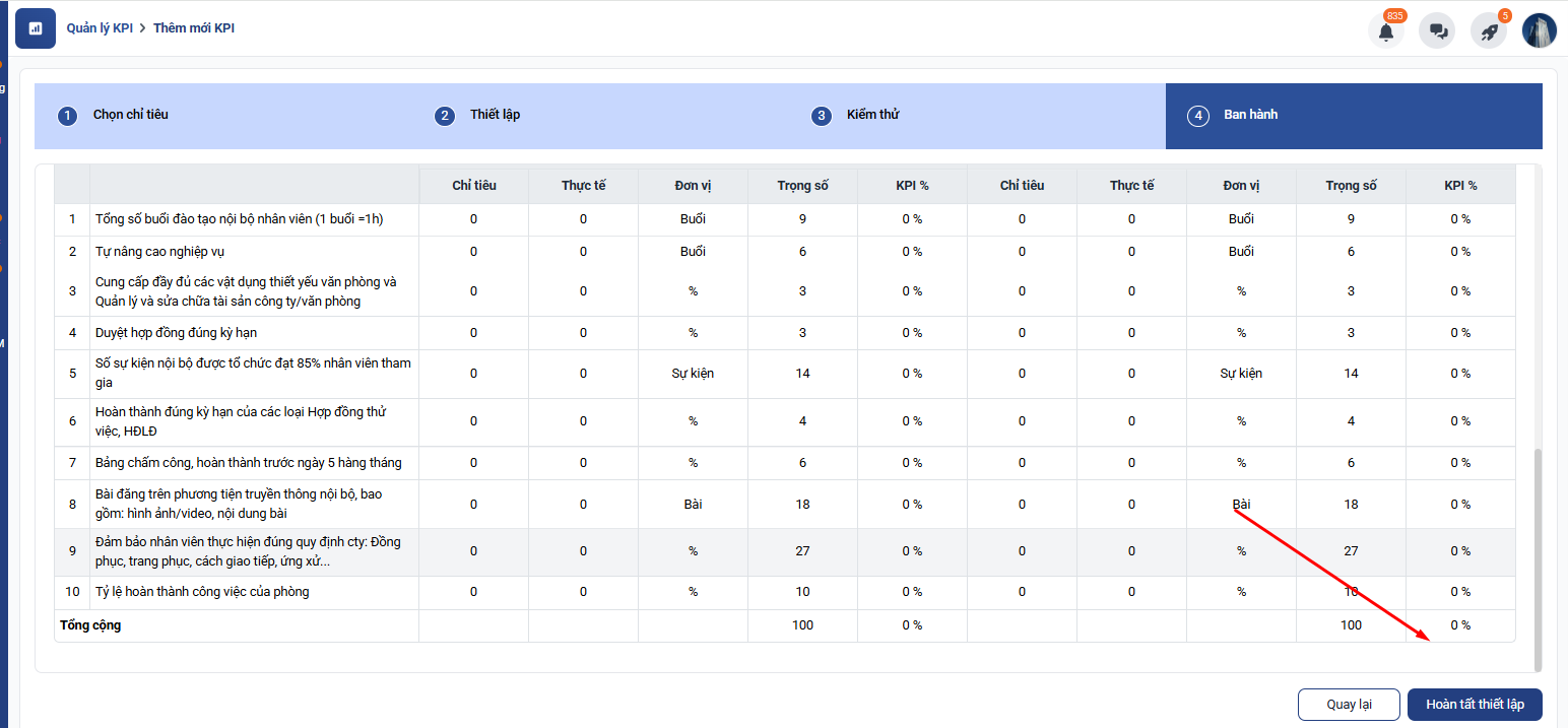 Bạn ấn tiếp theo và hoàn thành thiết lập để thêm mới bộ chỉ tiêu KPI dành cho nhân viên HCNS mà bạn đang thực hiện.