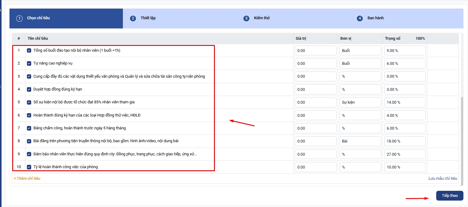 Lưu ý: Tổng trọng số của các chỉ tiêu phải bằng 100%.