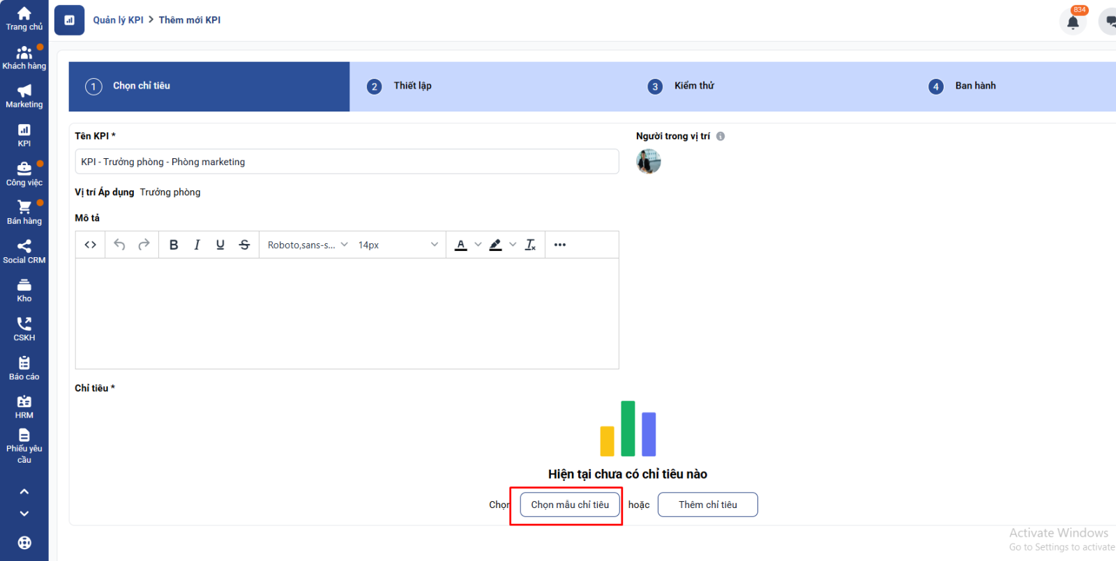 Bước 2: Lựa chọn chỉ tiêu KPI: