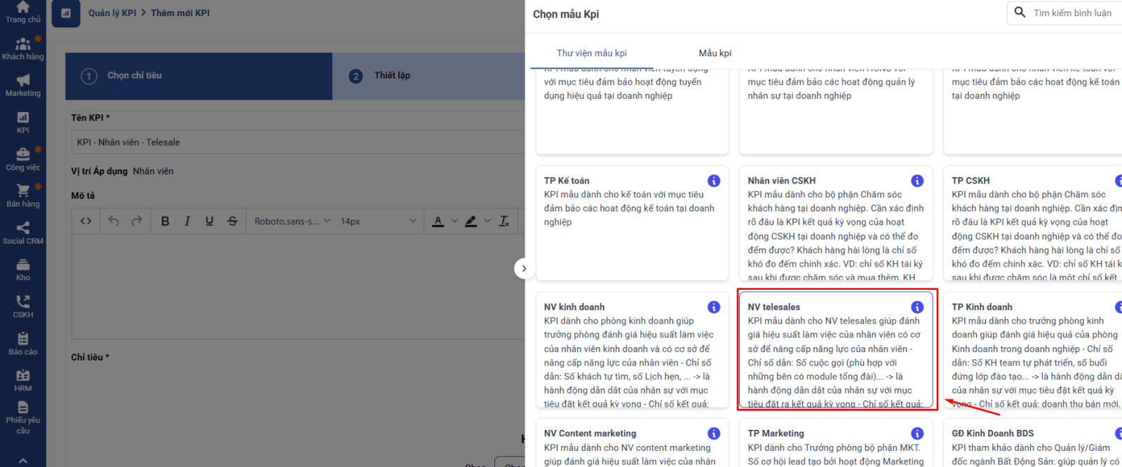 Tại màn hình thêm mới KPI → Chọn Mẫu chỉ tiêu → Thư viện mẫu KPI → NV telesales