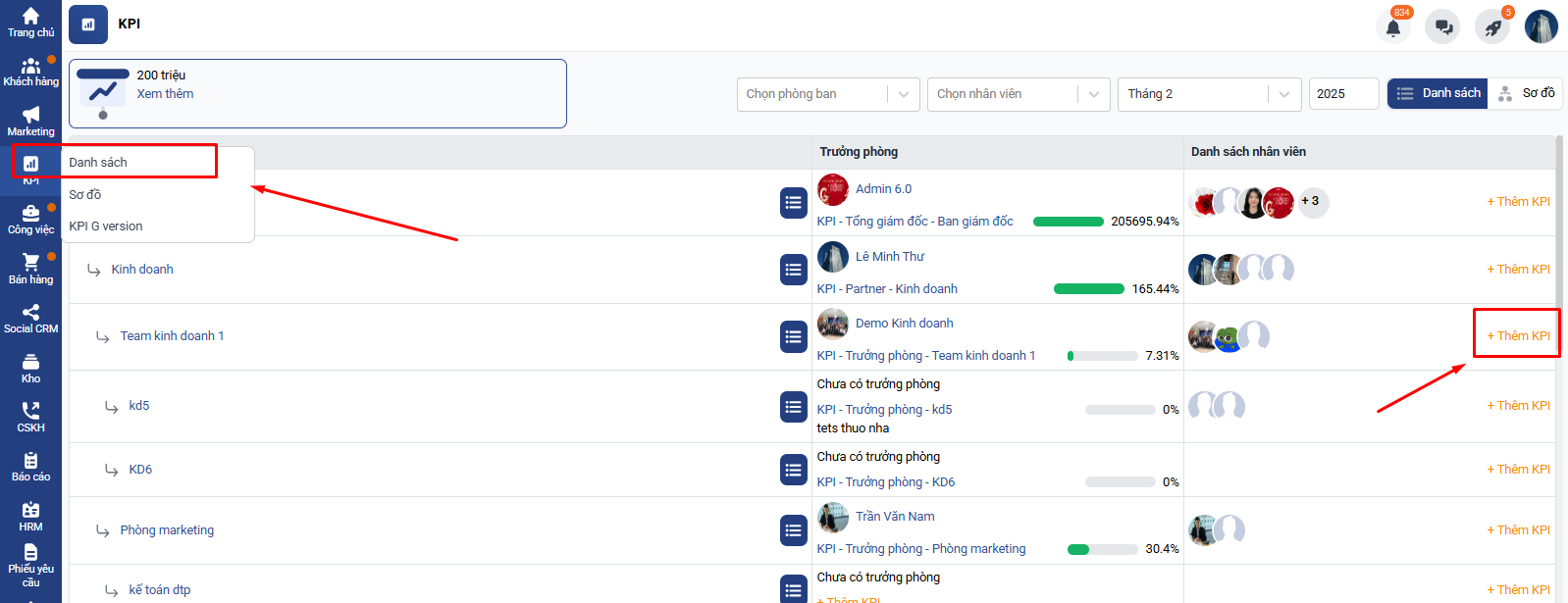 Bước 1: Chọn KPI → Danh sách → Chọn phòng cần giao KPI → Click thêm mới KPI