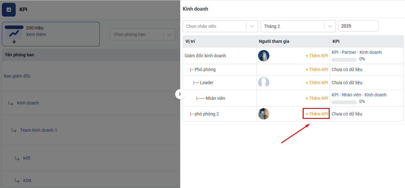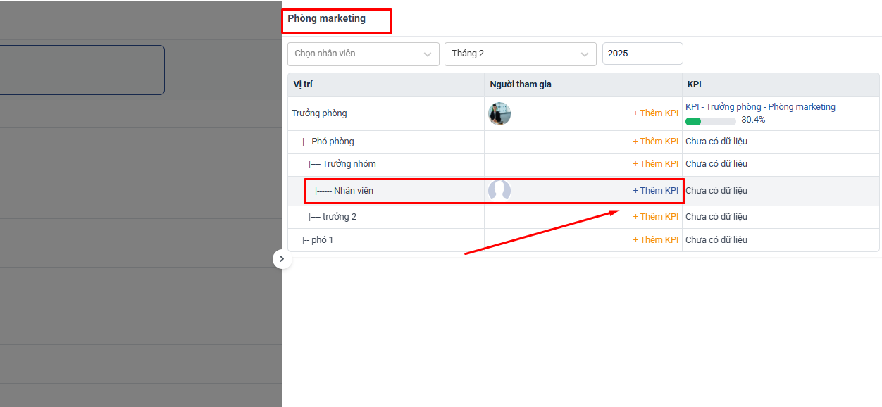 Các nhân viên trong phòng ban thuộc vị trí này sẽ mặc định được thêm vào KPI