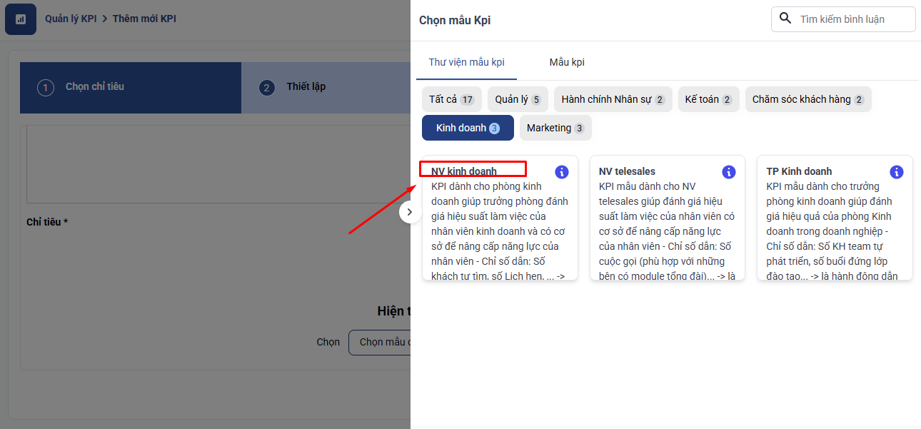 Tại màn hình thêm mới KPI → Chọn Mẫu chỉ tiêu → Thư viện mẫu KPI → NV Kinh doanh