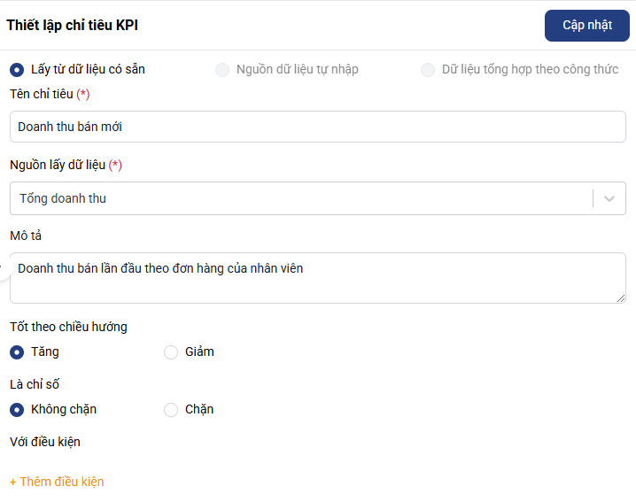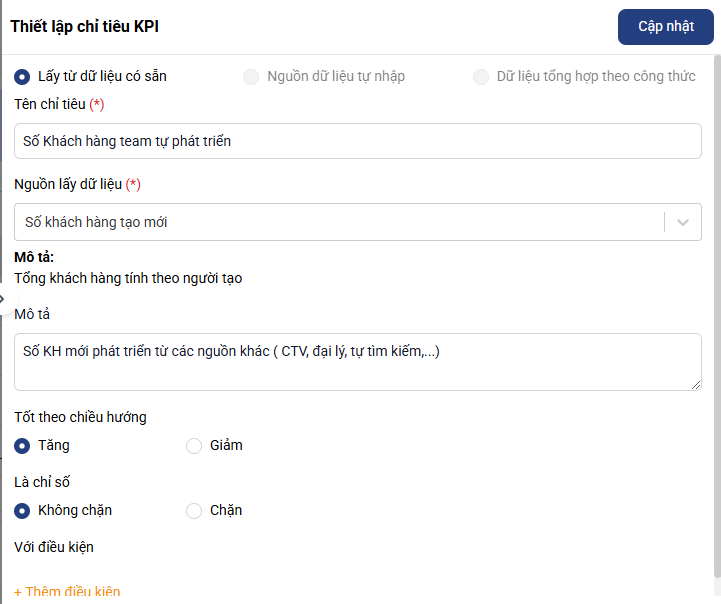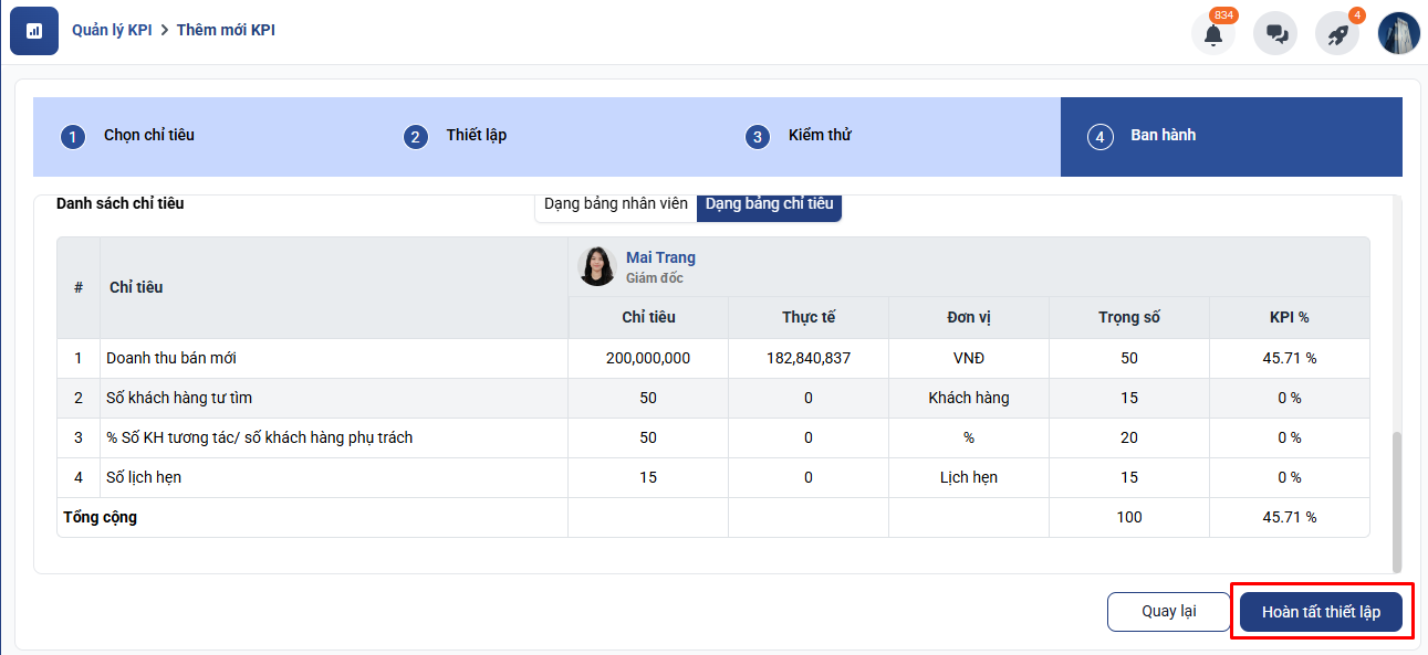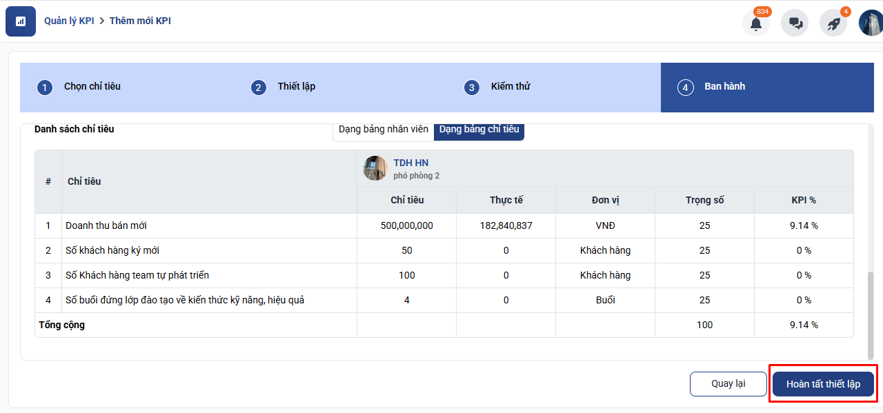 Sau khi nhập đầy đủ thông tin, nhấn Hoàn tất thiết lập để hoàn tất tạo KPI.