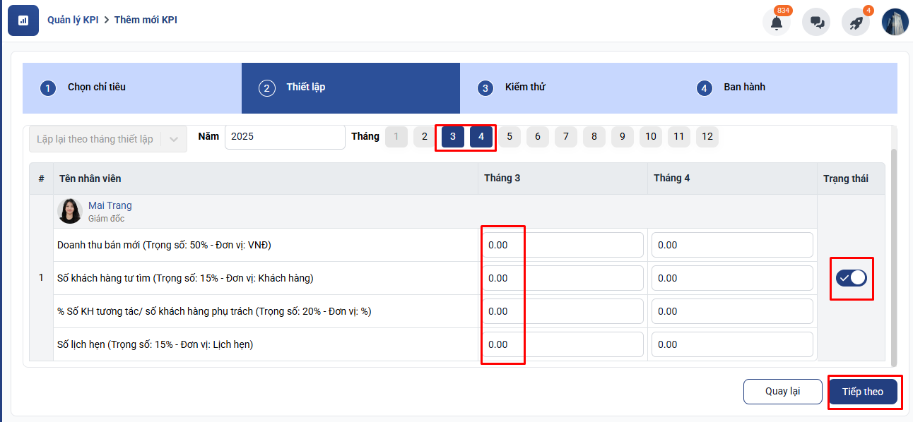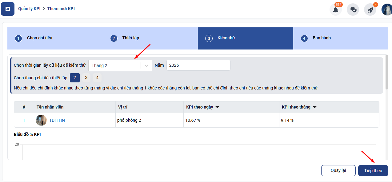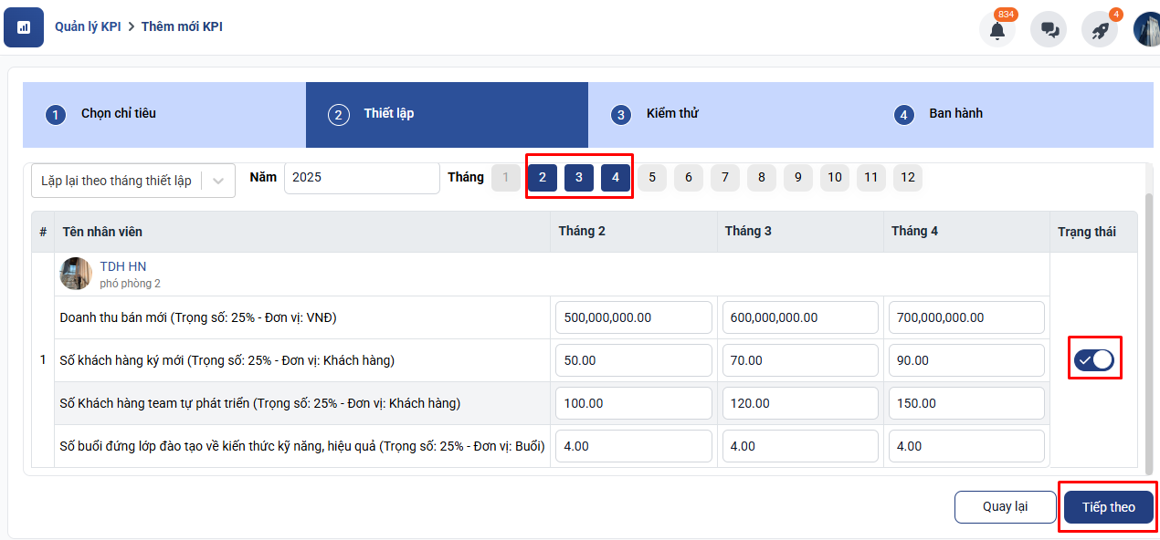 Bước 4: Cài đặt nhân viên và thời gian áp dụng KPI: