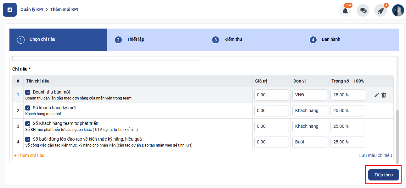 Lưu ý: Tổng trọng số của các chỉ tiêu phải bằng 100%.