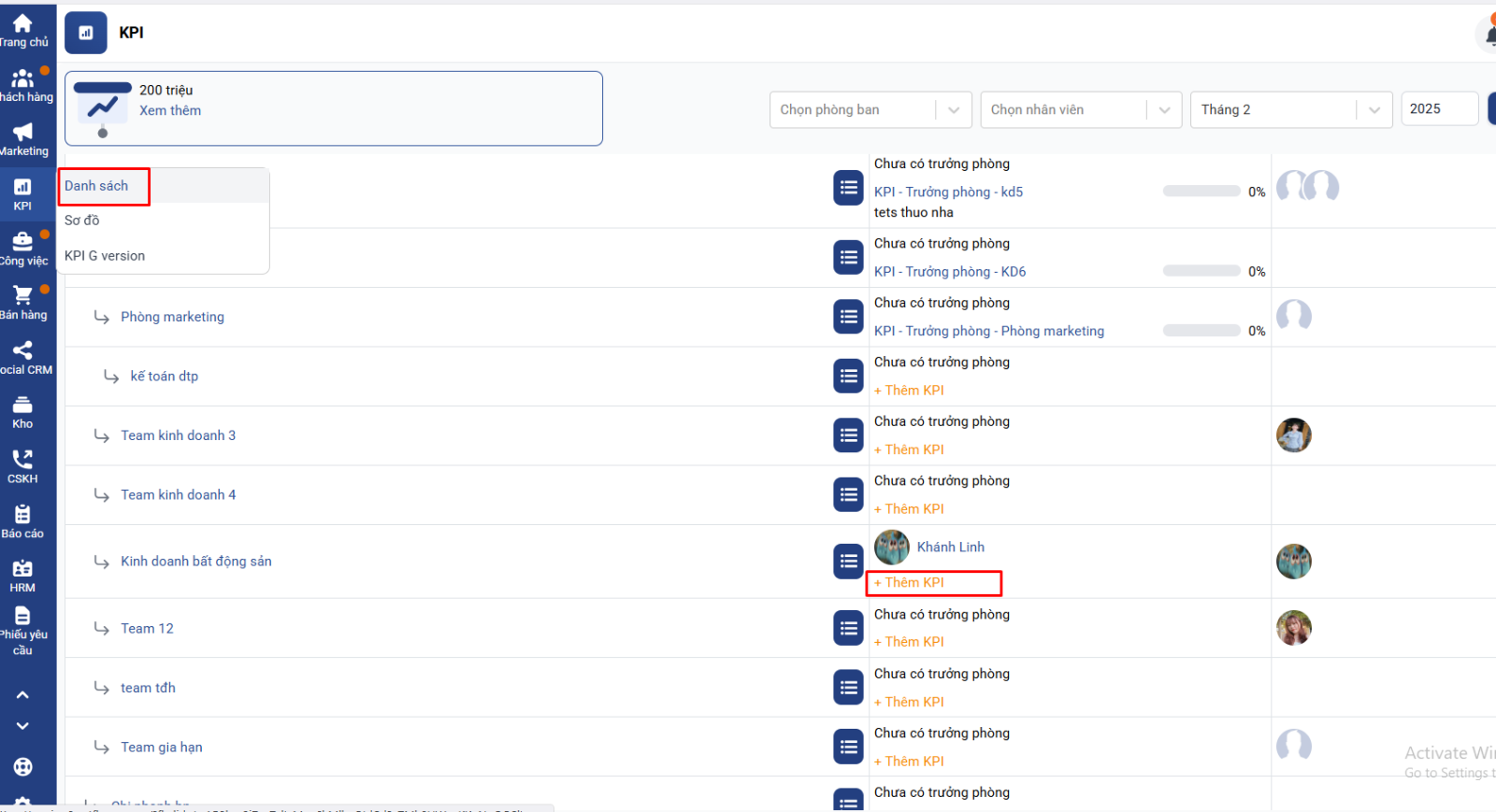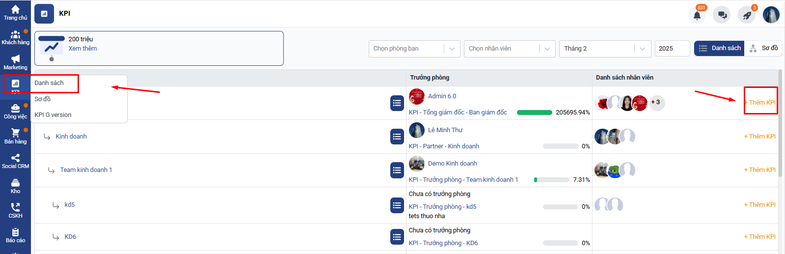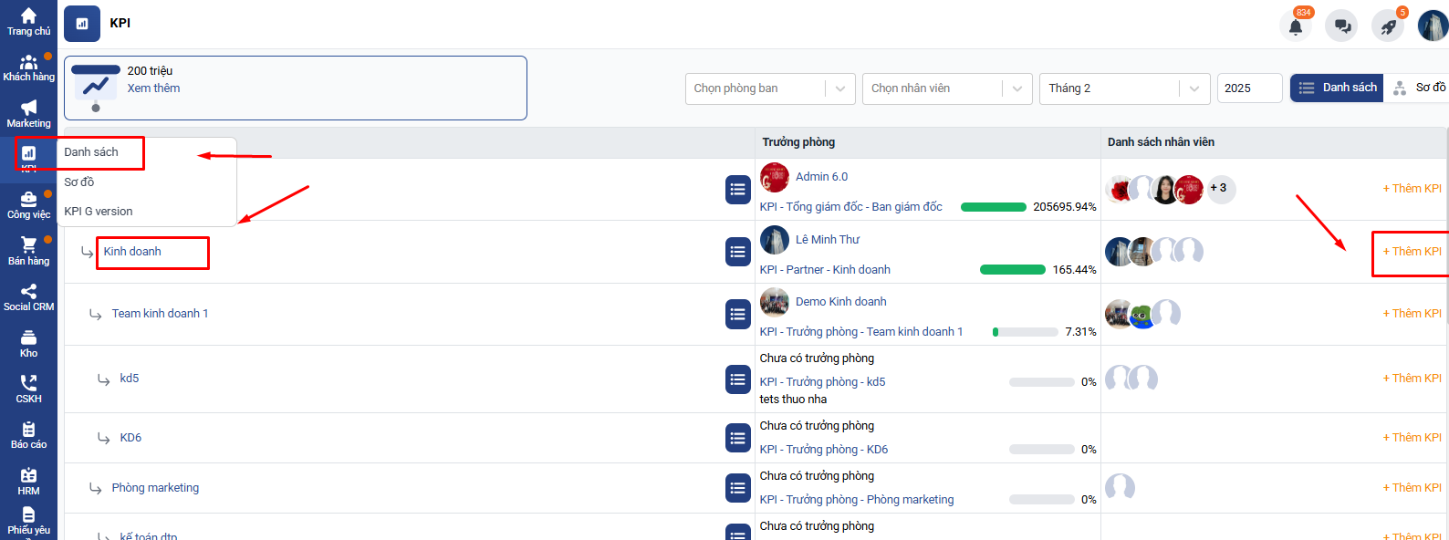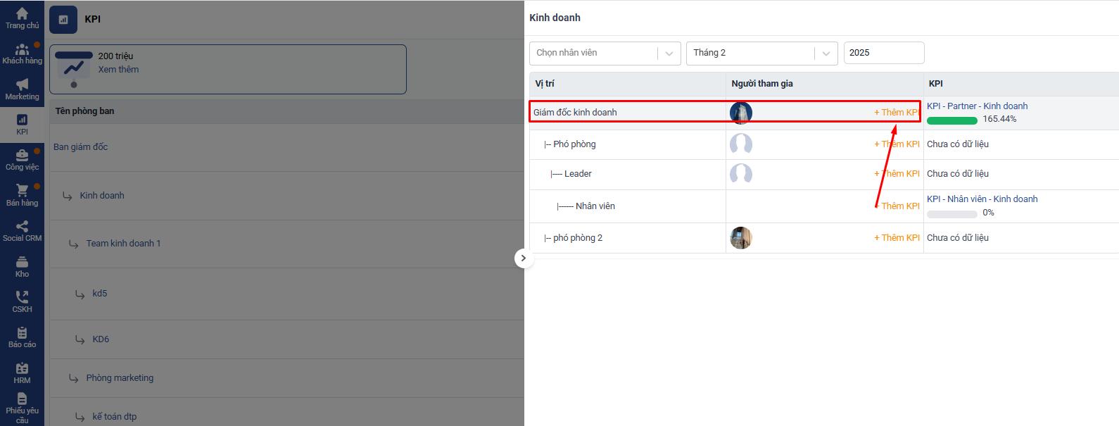 Chọn KPI → Danh sách → Chọn phòng cần giao KPI → Click thêm mới KPI
