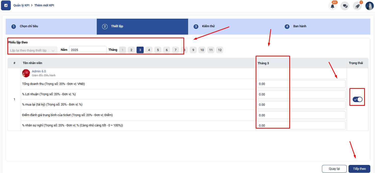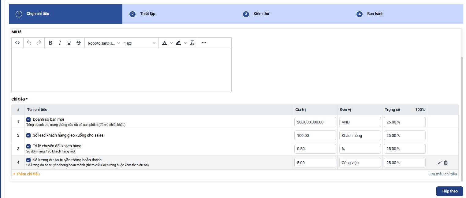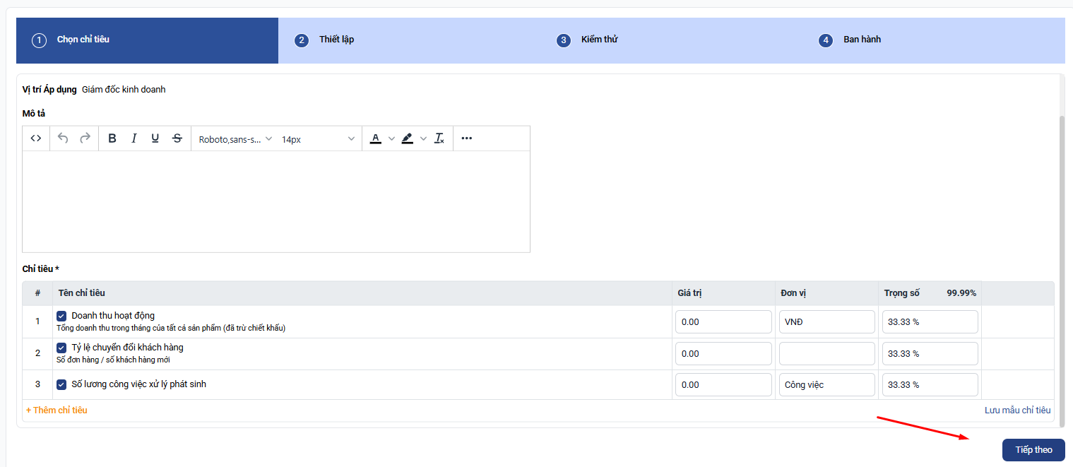 Bước 5: Bạn ấn tiếp theo và hoàn thành thiết lập để thêm mới bộ chỉ tiêu kpi dành cho Giám đốc kinh doanh bất động sản: