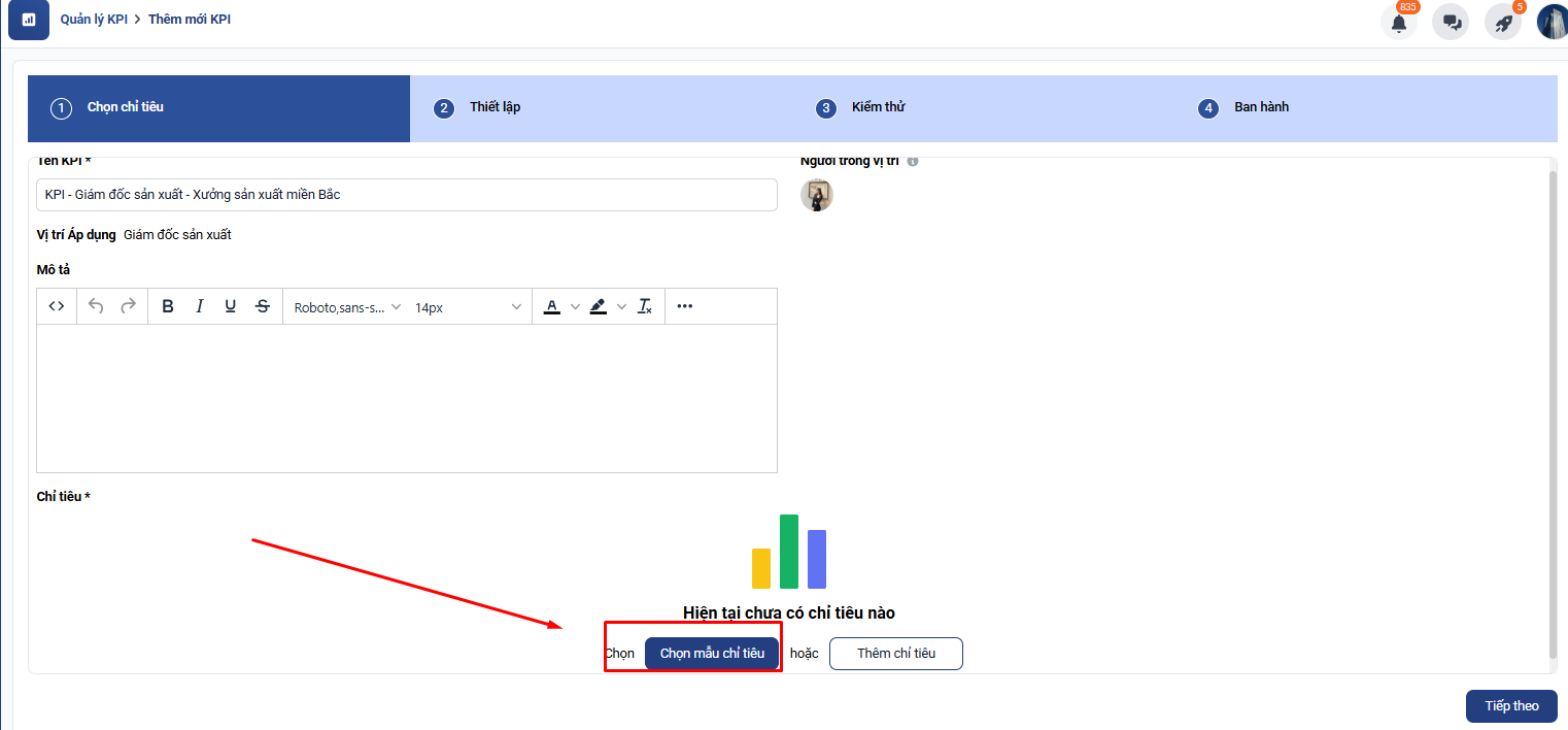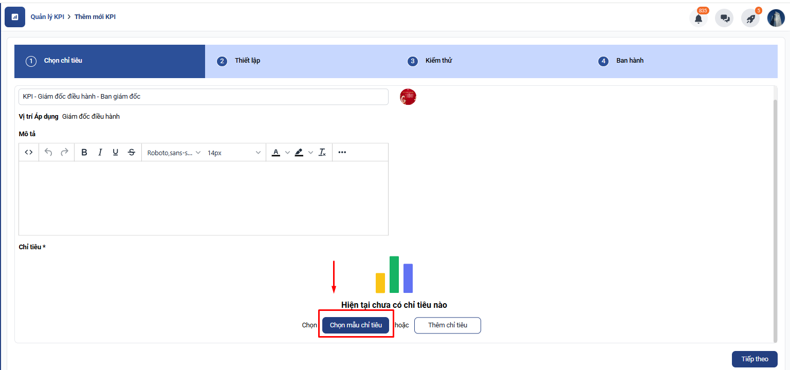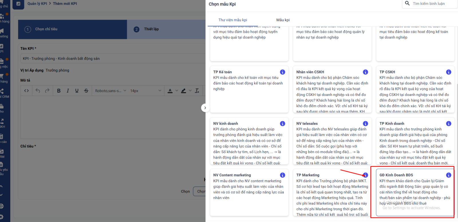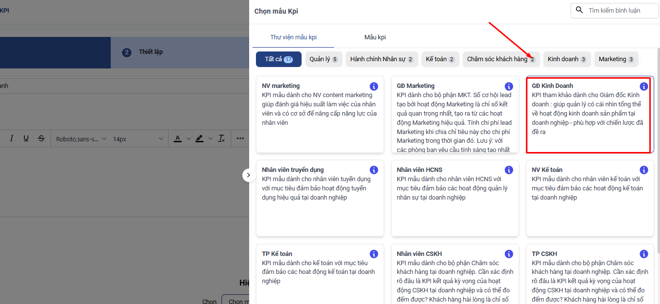 Tại màn hình thêm mới KPI → Chọn Mẫu chỉ tiêu → Thư viện mẫu KPI → GĐ Kinh Doanh