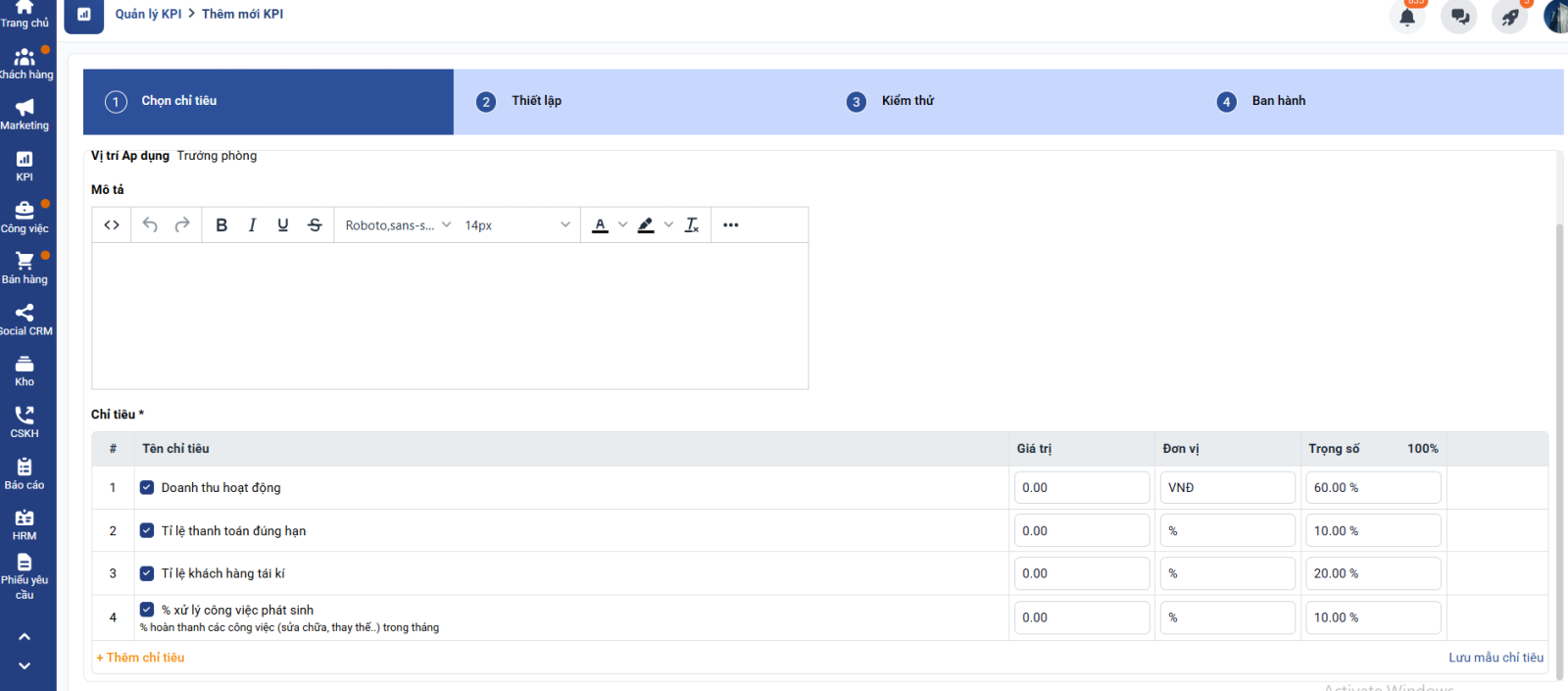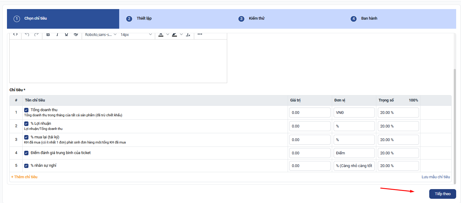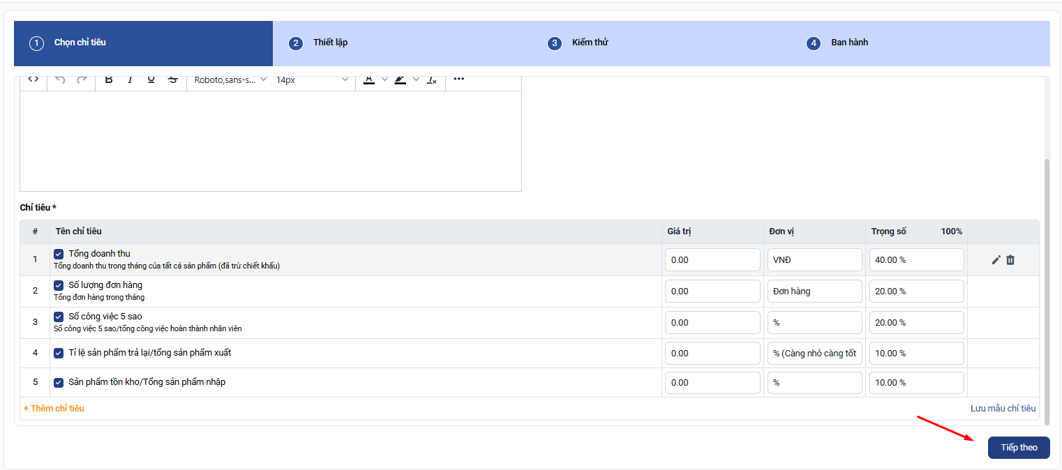Lưu ý: Tổng trọng số của các chỉ tiêu phải bằng 100%.