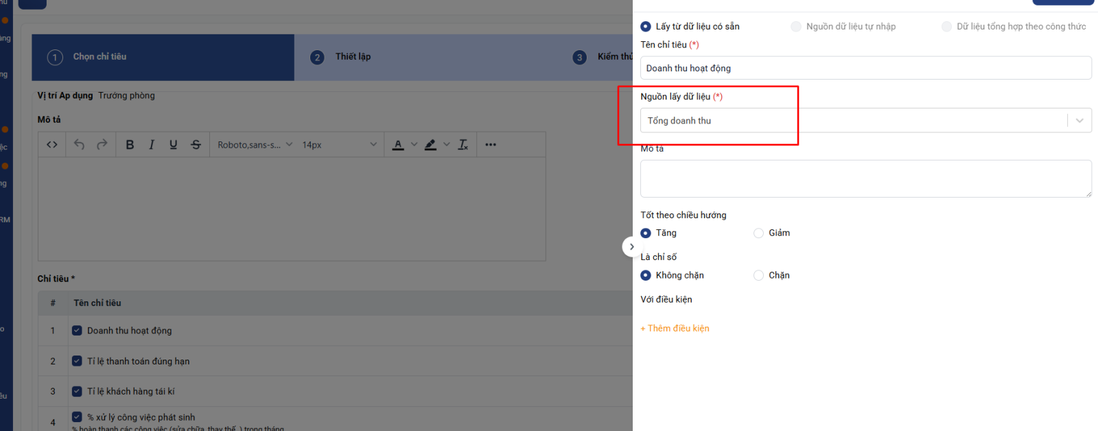 - Tổng doanh thu: Lấy tự động từ nguồn dữ liệu Tổng doanh thu