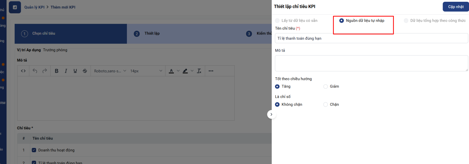 +Tỉ lệ thanh toán đúng hạn: đây là chỉ tiêu tự nhập, giám đốc kinh doanh có thể tự nhập số liệu